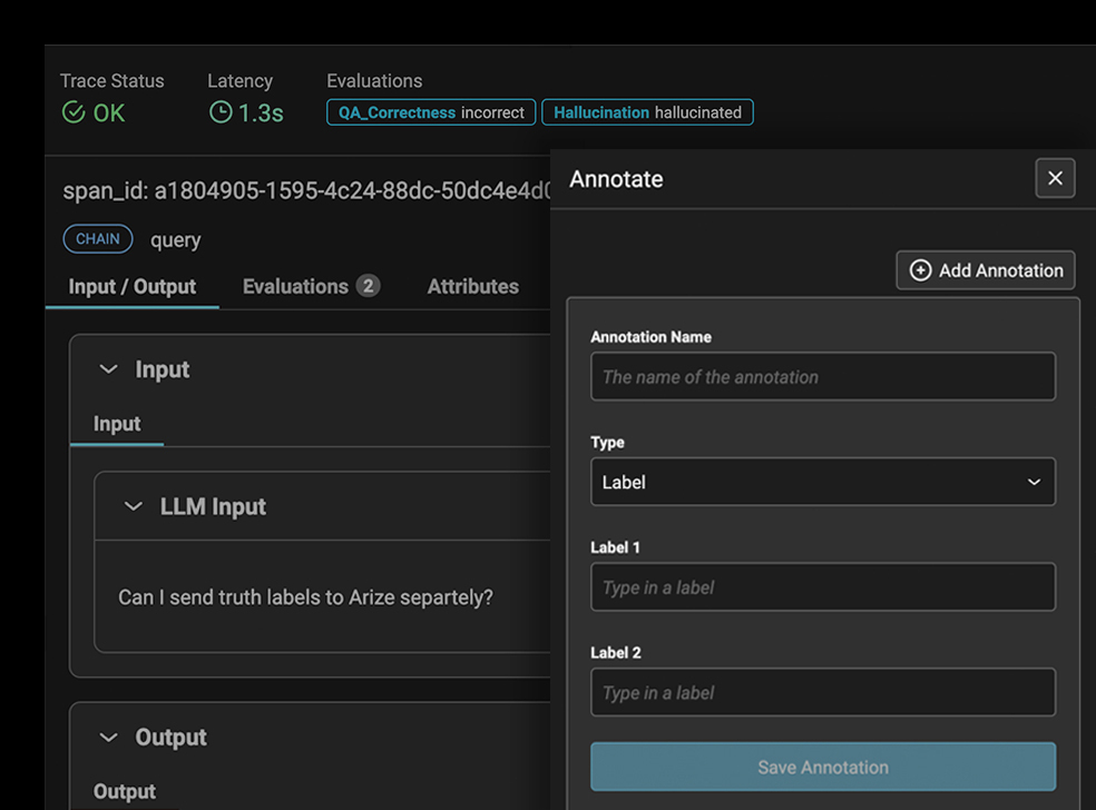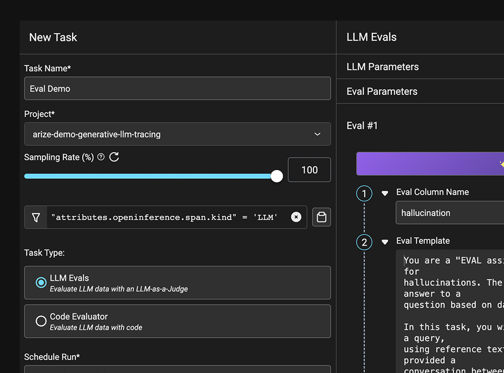 LLM 과제 성과에 대한 심층적인 평가를 수행합니다. Arize LLM 평가 프레임워크를 활용하여 빠르고 효율적인 평가 템플릿을 사용하거나, 직접 맞춤형 평가를 제작할 수 있습니다.