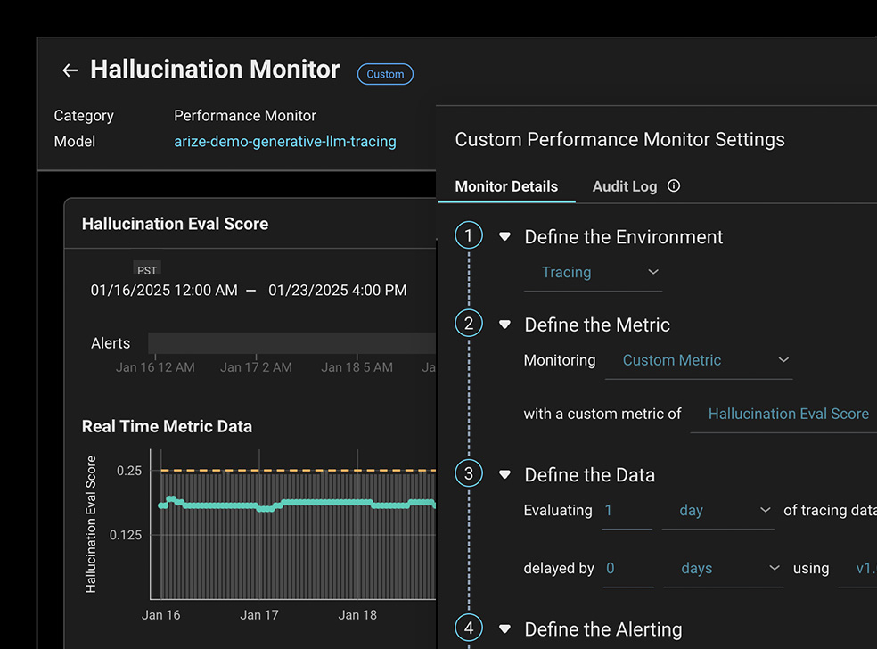 할루시네이션(hallucination)이나 PII 유출 등 주요 지표가 감지되면 상시 성능 모니터링과 대시보드가 자동으로 표시됩니다.