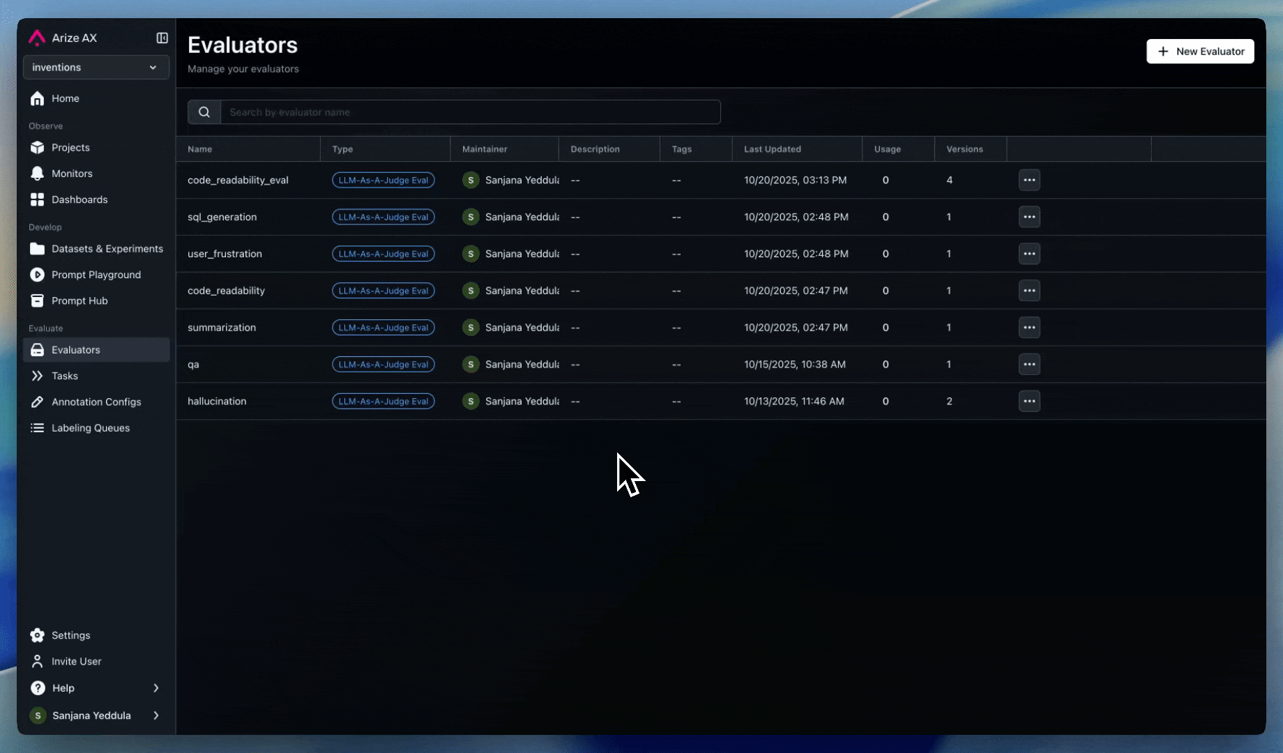 개발 단계의 오프라인 평가뿐 아니라, 프로덕션 환경에서 실시간으로 AI 출력을 평가하는 온라인 평가 기능도 제공합니다. Arize AI는 이를 "AI가 AI를 평가(AI evaluating AI)"하여 문제를 즉시 포착하는 방식이라고 설명합니다. 프로덕션에서 발생하는 품질 저하를 실시간으로 감지하여, 사후 대응이 아닌 사전 대응이 가능합니다.